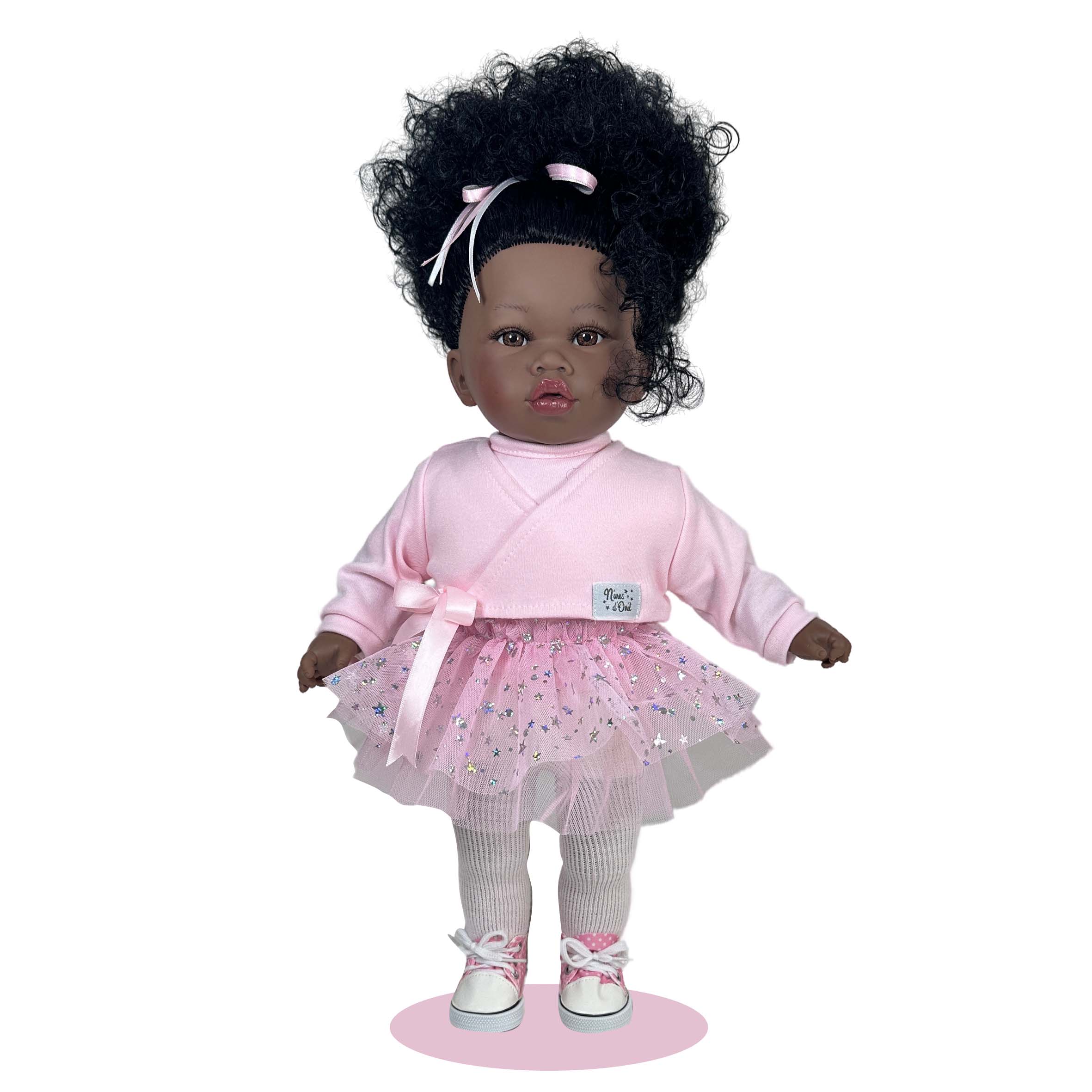 Lalka mówiąca po polsku 8 zdań: mamusiu przytul mnie, kocham cię, pobawmy się itd. Ma miękki brzuszek i winylowe kończyny. W zestawie posiada kosmetyki dla dziecka. Pakowana jest w plecak worek, ma 45cm.
