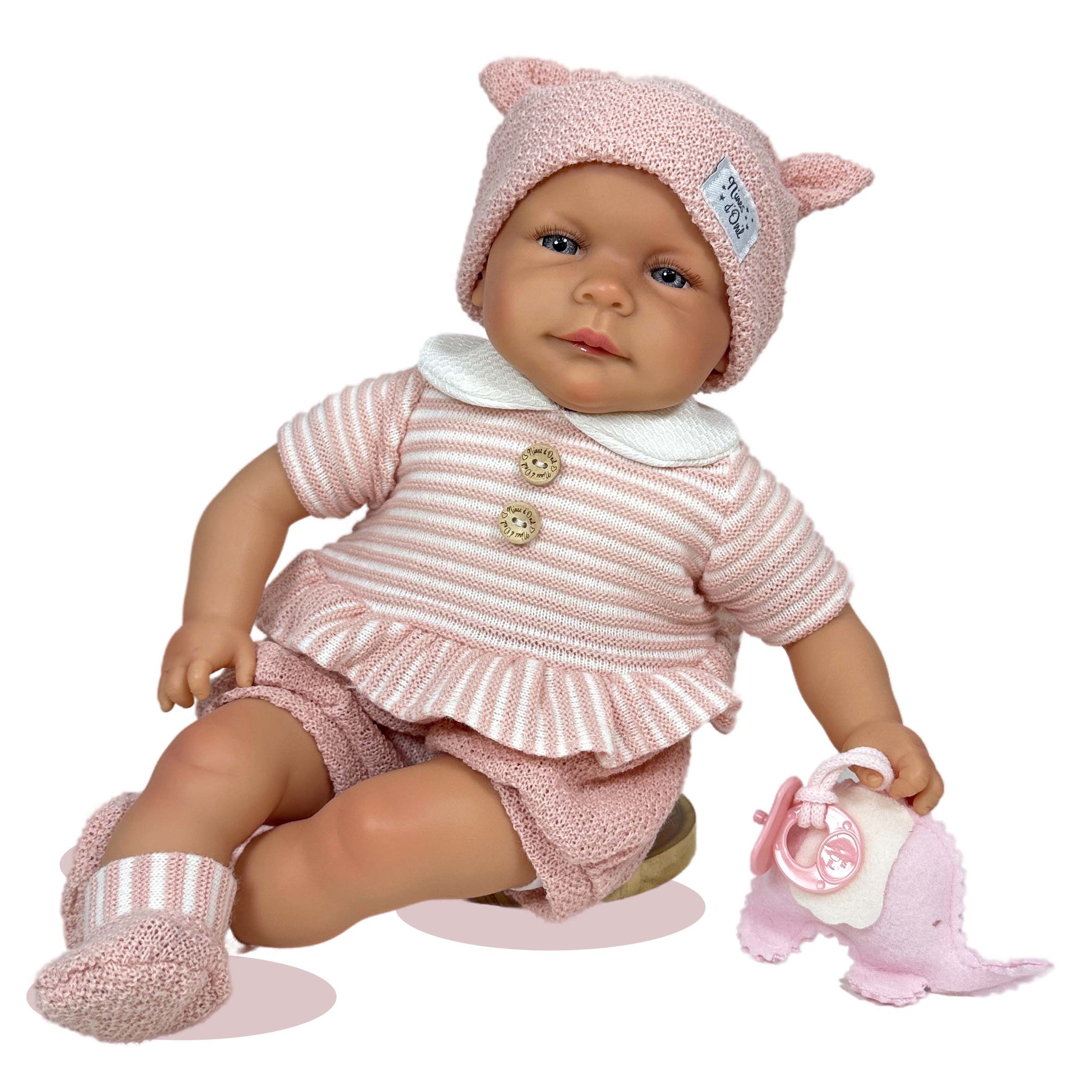 Lalka mówiąca 8 zdań po polsku, m.in: mamusiu przytul mnie, pobawmy się, kocham cię mamusiu. W zestawie posiada smoczek z zawieszką. Ma 45cm, pakowana jest w plecak worek.